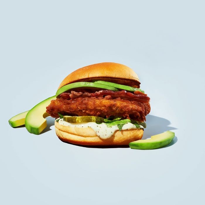 For something different, try the Avocado Chicken, featuring a tender antibiotic free chicken, paired with avocado, applewood-smoked streaky beef, crisp lettuce, tangy pickles, and a rich buttermilk herb mayo.