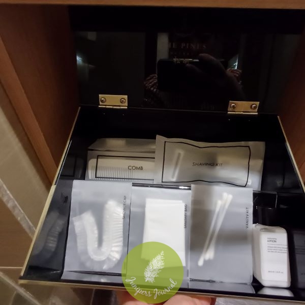 But back to the hotel room – lack of work desk notwithstanding (that means it’s all play and no work in the Poolside Suite, capiche?.The washroom is not that spacious but adequate and there is a pretty box of amenities, e.g. sewing kit, shower cap (that’s very important for me).