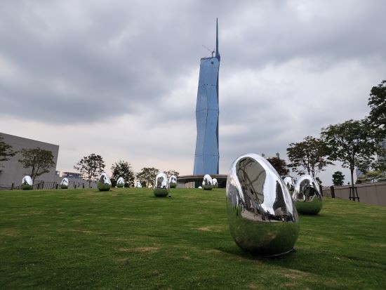The Rooftop Garden, which features countless ovoids, is an art space that transforms through changes in the natural environment and the presence of people. Under the sun, the ovoids reflect the world around them. As the sun sets, the ovoids begin to shine by themselves. When an ovoid is pushed by a person, blown by the wind, or hit by rain, it shines brightly and emits a sound tone as it rises back up on its own. The ovoids around it also respond one after another, resonating out the same sound tone and light color. The surrounding Resonating Trees also respond and change continuously.
