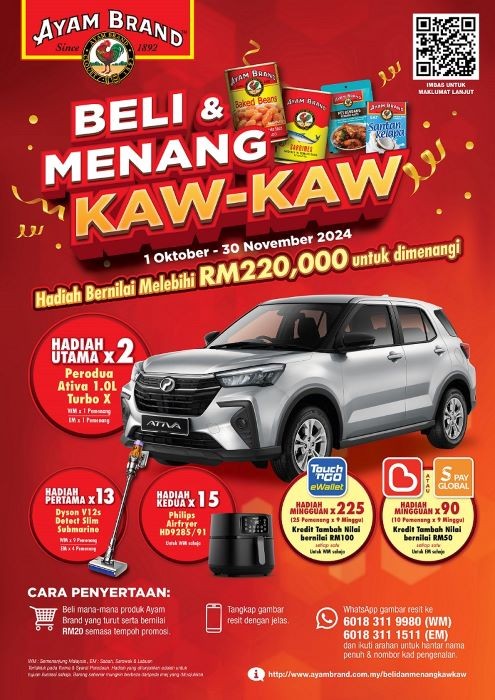 Yet another reason to enjoy A Taste of Malaysia is the Ayam Brand Beli & Menang Kaw-Kaw nationwide contest from October 1 to November 30 2024 with jaw-dropping prizes totalling up to RM 220,000, including a Perodua Ativa 1.0L Turbo X , Dyson products and more amazing rewards. To join purchase any Ayam Brand products worth RM20 or more in a single receipt, Whatsapp your receipt photo to enter. More details visit : https://www.ayambrand.com.my/belidanmenangkawkaw