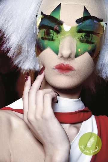 The look for the Gareth Pugh show at London Woman Fashion Week Spring/Summer 2016 was executed with a flesh-toned stocking over the head. Then the following details over the stocking : Marine Ultra and Pure White MAC Pro Acrylic Paints mixed together and placed onto the eye in an egg-rectangle shape with a soft-point sponge to apply. Rapidblack Penultimate Eye Liner used to sketch black lines above the brow, through the crease and under the brow. MAC Pro Black Black Acrylic Paint drawn over Rapidblack Penultimate Eye Liner to thicken the lines.