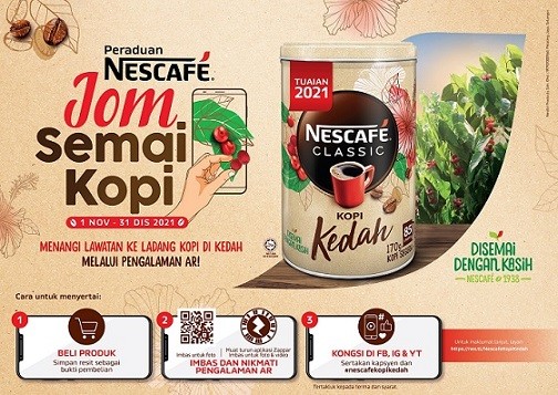 Coffee lovers eager to visit the birthplace of NESCAFÉ Classic Kopi Kedah can take part in Peraduan NESCAFÉ Jom Semai Kopi from 1 November to 31 December 2021. Participants simply need to purchase the 2021 edition of NESCAFÉ Classic Kopi Kedah and scan the QR code available in the packaging to enjoy a Virtual Coffee Farm Visit through an Augmented Reality (AR) experience. The AR app features a series of filters that can be used to develop a creative photo or video. Participants can post this to their Facebook, Instagram or YouTube accompanied by the hashtag #NescafeKopiKedah and an interesting caption to be in the running!