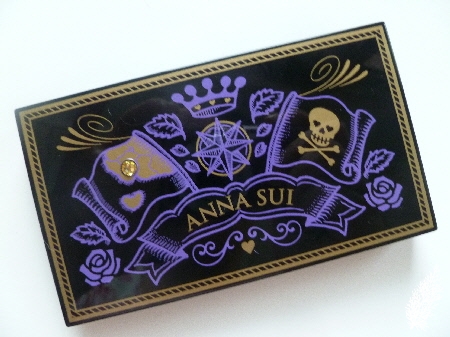 It has been some time since my last Anna Sui eye shadow palette. I have been waiting for Anna Sui to come up with a palette with a whimsical, fun, funky design which is unique both inside and out. Finally, it’s here. These 2 palettes from Anna Sui’s Beach Collection consist of 3 eye shadows and 2 lip colours each. The case reflect the Anna Sui signature colors of black and purple. With gold added, the case has a rocker chic vibe to it. There’s a yellow rhinestone on the left side of the cover too.