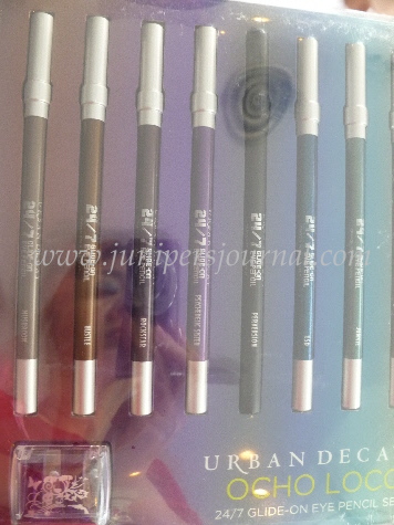 Those of you familiar with Urban Decay’s 24/7 Glide-On Pencil Sets will know that Urban Decay almost never creates a set with full-size pencils. Well, coming to Sephora outlets here in January 2013 is this set with not 5, not 6, not 7 but an astonishing 8 full-sized 24/7 Glide-On Eye Pencils. The set mixes 4 new and exclusive brights and shimmers with some of Urban Decay’s best-selling sexy shades. Also included is a Grind House Double Barrel Sharpener.