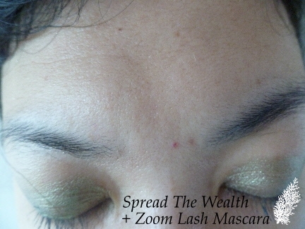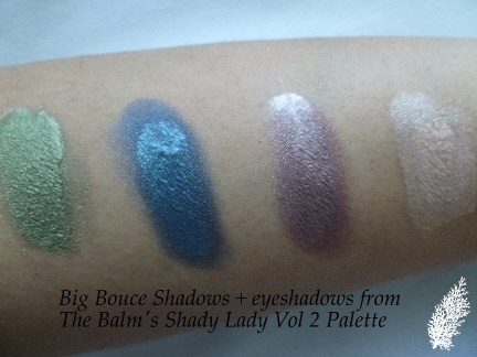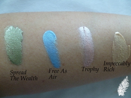 When I first laid eyes on the Big Bounce shadows, I was really taken by a few colours which I thought were outstanding. Two of the colours are in the pic above, Spread The Wealth (described as “dirty olive with gold pearl”) and “Free As Air” (described as “sky blue with silver pearl”). I like Trophy (described as “soft peach with pearl”) because it can be paired with so many neutral shades of powder eyeshadows. I love the names as the shadows as almost all of them have connotations to moolah!