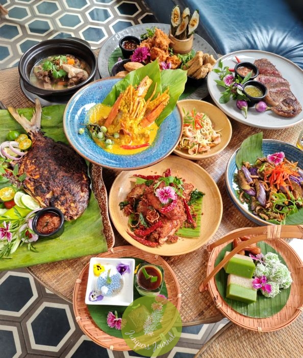 A heritage-focused menu highlighting sup kambing, grilled seabass with traditional condiments, slow-cooked meats, masak lemak, fresh greens, rice and classic desserts.