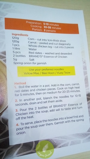 Instead of chicken, you can replace the meat with 2 bottles of BRAND’S Essence Of Chicken With Goji Berry. It’s a simple recipe which doesn’t require a lot of ingredients, perfect for anyone who wants a hassle-free soup, it tastes so rich and nourishing. I loved it and would have gone back for a second cup if I wasn’t in a hurry to leave to beat the evening rush hour traffic.