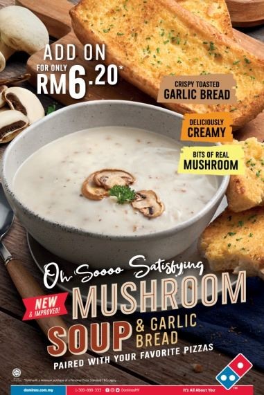 Domino’s takes comfort food to new heights with its all-time sides favorites, the Mushroom Soup and Garlic Bread duo. The creamy and flavorful mushroom soup, adorned with hearty mushroom chunks, pairs harmoniously with the iconic garlic bread. Priced at the incredible value of RM 6.20 for both items, this combination is sure to warm hearts and palates alike.