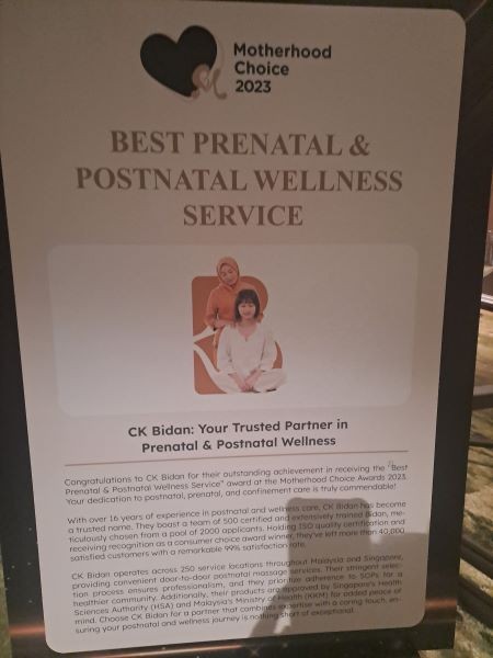 As we all know, mother-to-be and new mothers need the best prenatal/postnatal care & services possible to ensure the wellbeing of mother & child. For over 15 years, CK Bidan have been providing traditional Malay postnatal care and wellness solutions in Singapore and Malaysia. They received the “Best Prenatal & Postnatal Service Award” At The Motherhood Choice Awards 2023.