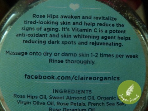 Claire Organics Whitening Rose Hips Scrub has fine granules and I like this one more than the previous one featured here as the Lavender Oatmeal Scrub has a chunkier texture and tends to drop off as I am applying it on my skin but with the Whitening Rose Hips Scrub, it stays put on my skin while I am massaging it on. I do like finer textured body scrubs in general. The scent of this scrub is like crushed roses, nothing artificial about it.