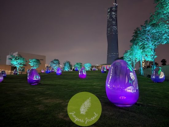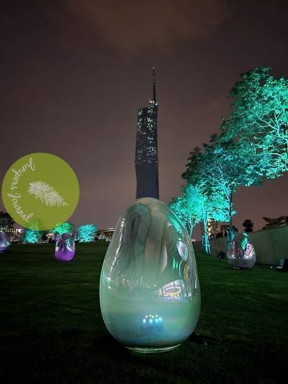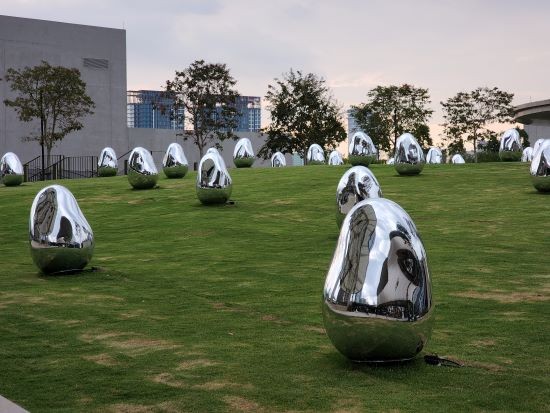 The Rooftop Garden, which features countless ovoids, is an art space that transforms through changes in the natural environment and the presence of people. Under the sun, the ovoids reflect the world around them. As the sun sets, the ovoids begin to shine by themselves. When an ovoid is pushed by a person, blown by the wind, or hit by rain, it shines brightly and emits a sound tone as it rises back up on its own. The ovoids around it also respond one after another, resonating out the same sound tone and light color. The surrounding Resonating Trees also respond and change continuously.