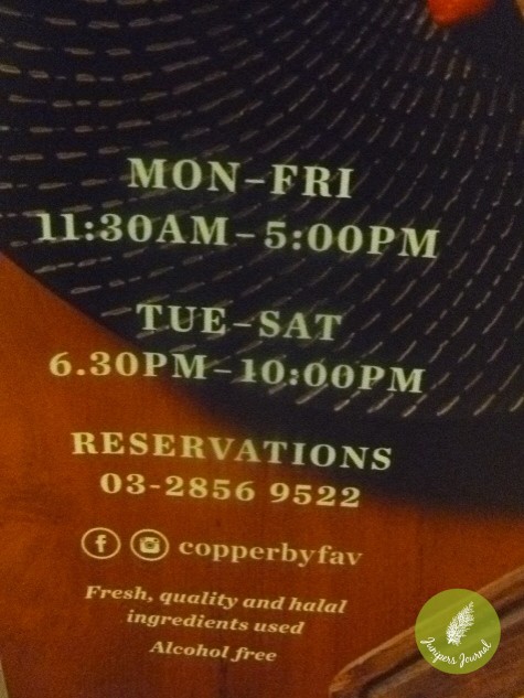 There’s a “Small Plates” section in the menu – these are starters which can be shared among a few people. Small plates are available from 6.30-10pm Tuesdays to Saturdays. Copper used to be open only for lunch when they first started a year ago. There are separate sections at Copper so you can have a private function with your own space and they don’t have to close the restaurant to other diners.