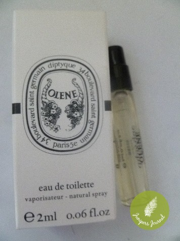 I can tell that Diptyque fragrances are a lot more pricey than the ones I generally use. Their Olene EDT is in the floral family and consists of Wisteria, Narcissus, Jasmine and Honeysuckle. Top notes are narcissus and honeysuckle; middle notes are wisteria and jasmine; base notes are green notes and white flowers. Olene was launched in 1988.
