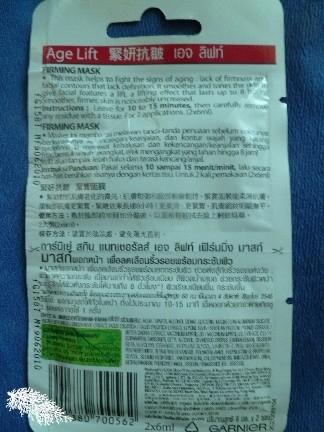 Garnier’s Age Lift range has a firming mask consisting of 2 x 6ml sachets. When I spotted it, I thought this was the rock-bottom cheap version of Lancome’s Renergie Morpholift Masque R.A.R.E™. Each sachet is for one application. It claims to help fight the signs of aging : lack of firmness and facial contours that lack definition.