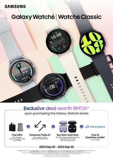 | Galaxy Watch6 Classic 47mm LTE | RM1,799 | Silver, Black | 20% off PWP on Galaxy Buds Series, Samsung Accessories and Samsung Care+.Free 15W charger[9] worth RM59 and free Watch Cradle worth RM129.Save up to RM300 in trade-in rebate[10]Free 35 ClassPass credits (worth RM250) for new sign up[11] |