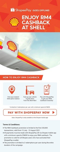 In celebration of this partnership, from now till 15 August, users will be rewarded with RM4 cashback when they spend a minimum of RM30 and pay with ShopeePay at any participating Shell stations.