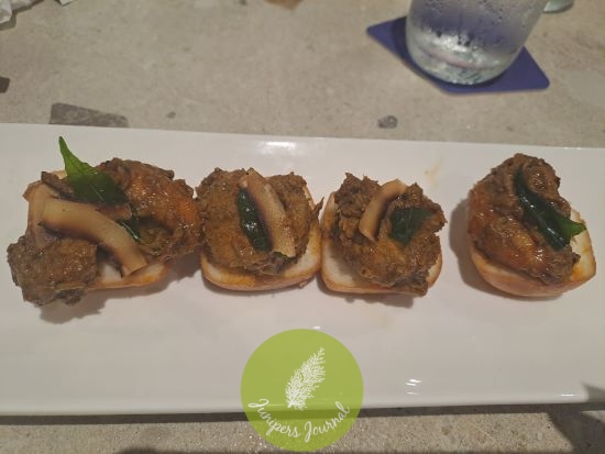 The 1st set of canapes served was the grilled meat platter – variations were fish, prawn, chicken and mutton. They were all good but my favourite was the prawn, light and mildly crunchy on the exterior, this was a delight to start the never-ending flow of canapes.