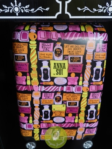 The 24-inch trolley bag : “The pattern comes from a mid-century modern tea towel, with a barber shop quartet theme. It originally appeared in my Fall 2012 Collection, which was inspired by the work of Charles and Ray Eames, and their collection of Folk Art Americana. We customised the print with Anna Sui slogans, perfume bottles and lipstick tubes.”