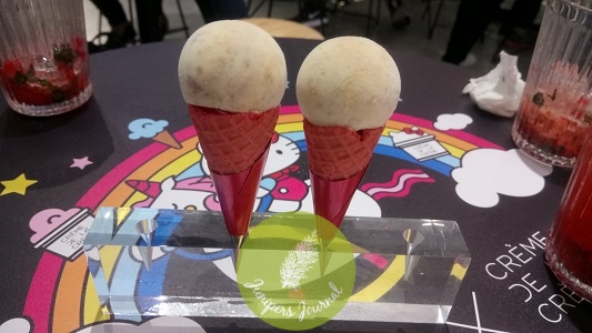 Although Friendship Ring doesn’t look as cute as Kitty White, this was my favourite. The combination of cream cheese ice cream, strawberry ice cream, strawberry jam, peach sorbet, citrus crumble and chocolate worked very well. Flavours were well balanced and complemented each other nicely. I felt this one had more depth of flavours than Kitty White and tasted richer. This is inspired by Hello Kitty’s favourite word, “friendship”.