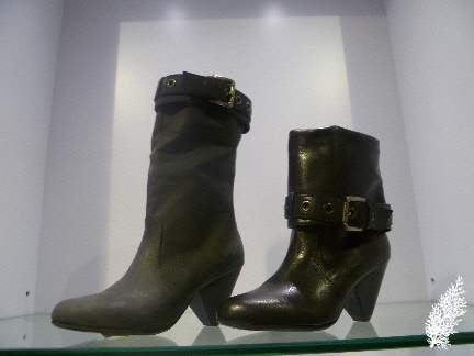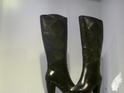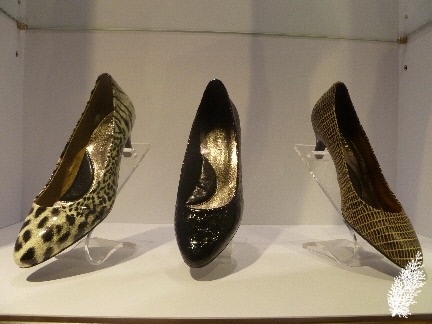 There are kitten heels in black and white animal prints. Check out the black “alligator skin” kitten heels and the thigh-high boots, very sexy and alluring!