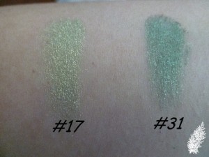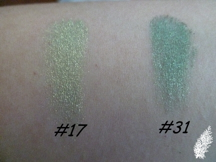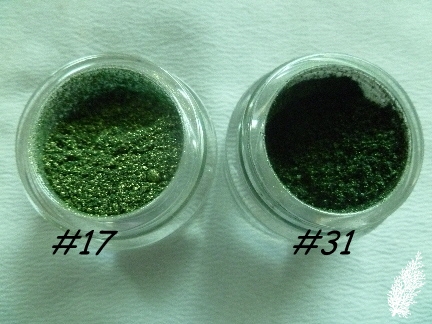 I can never remember the numbers of my pigments, wish they had names instead. #17 is a lovely soft yellow-green which can be paired with most green eyeshadows whereas #31 is a darkish green. The best thing about the pigments is that such a minute amount is needed for each application.