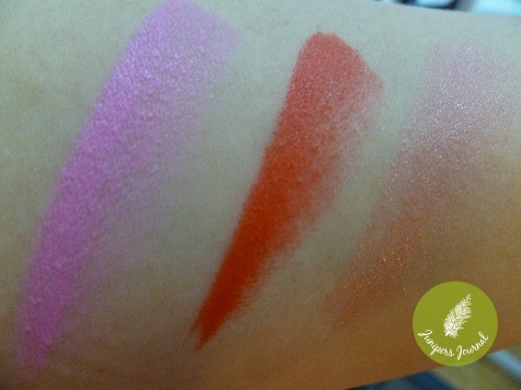 The swatch in the middle (coral orange) looks quite promising and the texture does feel very creamy and hydrating.