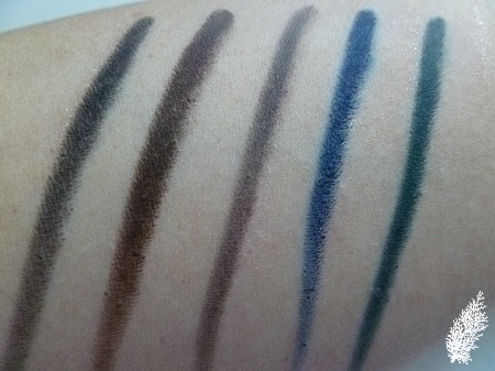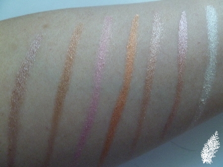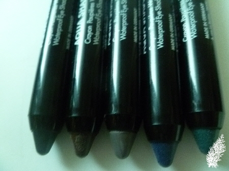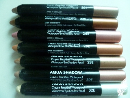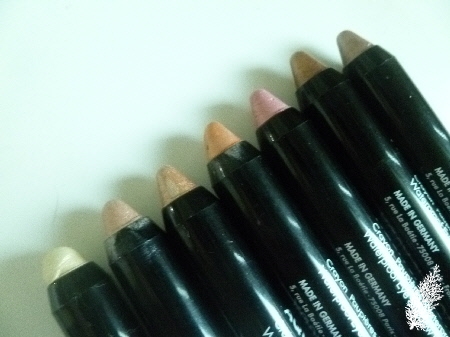 All the shimmering shades are in nude colors and great for day use. For night time wear, just apply the mattes as eyeshadows or eyeliners for a smoky look. They have to be sharpened to quite a fine tip in order to work as liners.