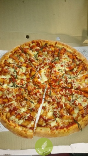 dsc_0021One slice neatly fits my big plate with just a little room to spare. At first bite, I detected a slight sourish taste which is only one of the many flavours contained in this delectable creation. The Fried Chicken is chunky, moist and tender. There is the fragrance of fresh basil. The ingredients are generous and you can see at first glance that this isn’t your average pizza. This is definitely THE pizza for fans of fried chicken.