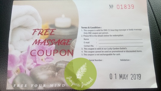 At registration, I completed a form that asked me my massage strength preference, that’s considerate since some people like it gentle and some people (like me) prefer it strong. At the same time as my registration, two other ladies stepped in with the complimentary voucher and they had chosen the body massage. The body massage section is upstairs while the foot massage section is on ground level.