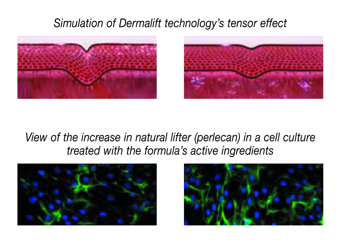 Dermalift contains a complex of polypeptides and yeast extract and was designed to stimulate synthesis of the 8 natural lifters (in vitro tests), including the stabilizing lifters, so that, by taking action on the dermal-epidermal junction, the formula can help skin re-tighten and re-pulp itself from within.