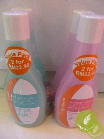 When I see a value pack like Sally Hansen Nail Polish Remover, I take a closer look and what I saw was too tempting. Not just the price but each pack comes with a Sally Hansen nail polish. The blue liquid is the Moisturising version while the pink liquid is the Strengthening version. Too bad they don’t have a pack with one of each.