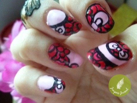 First, Lucyy started off with a pink base (all products used are OPI even though she doesn’t have the Hello Kitty by OPI Collection) and then drew the black edges. She filled in the edges with OPI Dutch Tulips, such a striking red.