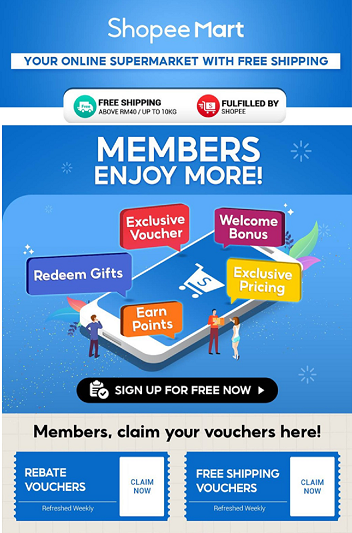 - This in-app portal offers an assortment of products from groceries, household needs, as well as health and beauty products from various brands. Members of Shopee Mart are entitled to rebate and free shipping vouchers which are refreshed every Saturday, as well as exclusive prices for a variety of items. Members will also earn points for their purchases which can be used to redeem free gifts. To apply for the Shopee Mart membership, do visit their site here: https://shopee.com.my/shopee_mart.