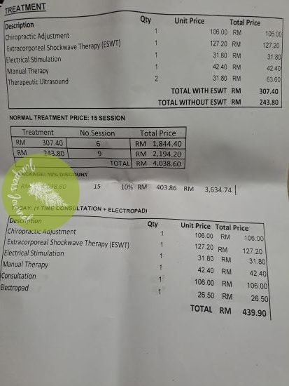 When I saw the total amount for 15 sessions, my head was spinning a bit as it was definitely way out of my budget. Even if I paid for each session as I went along, it was still out of my budget as I had only been paying RM200 per session at MyBowen Therapy. I was sure there are other chiropractic centers which are within my budget. Now I am not saying their charges are unreasonable, I am sure my problem would be resolved if I took up this treatment plan. However, I need to have my treatments at a chiropractic center which fits within my budget so I decided to continue searching.