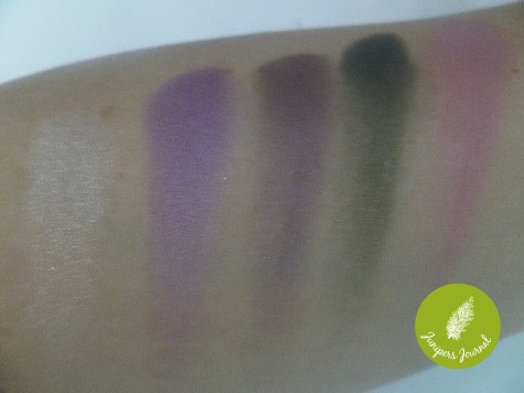 My favourite shades in the palette are on the top row especially the gold and silver. The violet and dark purple on the second row are nice but I have dupes for them in other palettes so they aren’t very special to me although they are lovely purples. There’s only one light shade which can be used as a highlighter.