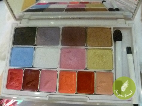 I don’t see a cover on the eyeshadows of the has-it-all eye and lip palette so that the lip shades are kept free of any migrating eyeshadows. The with-love-from-paris brush set comes in a metallic silver envelope pouch, very sleek indeed.