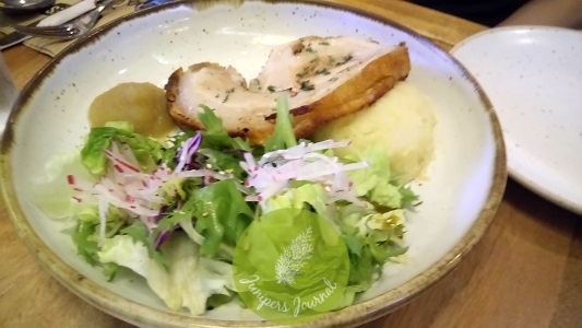 Devonshire Roulade is slow roasted pork belly stuffed with English herbs. The pork belly has a layer of fat, the skin is crispy and the meat is delicious thanks to the herbs. The salad is the perfect complement to the pork.