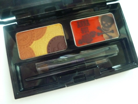 It has been some time since my last Anna Sui eye shadow palette. I have been waiting for Anna Sui to come up with a palette with a whimsical, fun, funky design which is unique both inside and out. Finally, it’s here. These 2 palettes from Anna Sui’s Beach Collection consist of 3 eye shadows and 2 lip colours each. The case reflect the Anna Sui signature colors of black and purple. With gold added, the case has a rocker chic vibe to it. There’s a yellow rhinestone on the left side of the cover too.