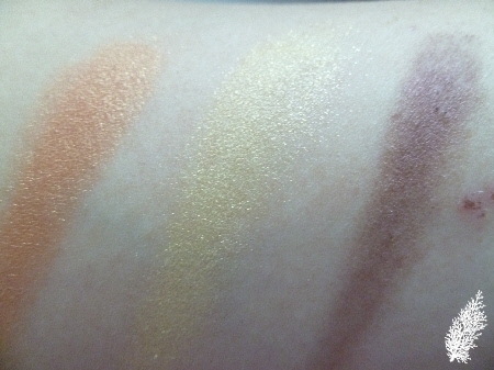 On the other hand, the 02 Sunset palette had 3 very complementary shades which matched each other perfectly. They really reflected sunset shades and while the colors are highly dupeable (L’oreal’s Magic Amber Open Eyes Chrome Intensity Palette 2010 has 2 shades very similar to the Copper & Gold in the 02 palette), there is a certain iridescent quality to these shades.