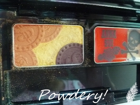 As the 3 eye shadows are next to each other, expect some migration of the shadows into each other, this is inevitable and unavoidable when there is no demarcation. The eye shadows are rather powdery as well and when I used them the first time, bits of it fell into the space for the brushes. However, the design embossed on the shadows makes up for these shortcomings. I guess the design reflects the coins from the pirate booty/treasure. Ka-ching! Ka-ching!