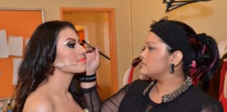 Haritha Shan touching up Safia Hanifah (Ulla) As the official makeup sponsor of Pan Productions’ The Producers, MAC Cosmetics’ work began months before the musical started to run at KLPAC…
