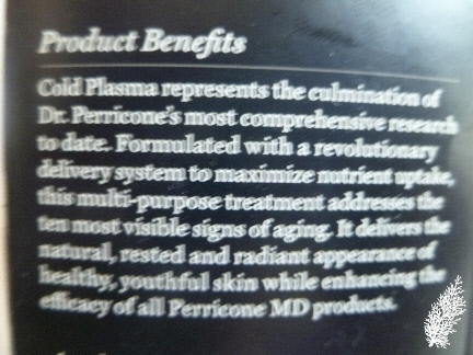 The science behind Cold Plasma is beyond my understanding (I never did like science as a subject, so there!). Cold Plasma is charged by Phospholipids which mimic the lipids naturally found in skin cells which make them compatible with skin. It is this compatibility that allows the quick absorption of nutrients to the skin, maximizing their benefits for unparalleled results. Dr. Perricone has infused this delivery system with a powerful cocktail of nutrients :