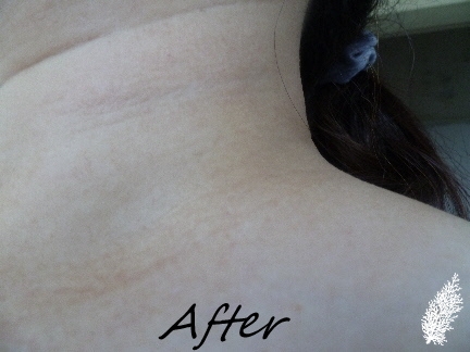 After 14 days of continuous, dedicated and diligent application, there was also an improvement in the appearance of the lines on my neck and collarbone as well as the Marionette lines, especially the deep line on the right side of my face. The lines looked less deep and pronounced, the lines on my neck and collarbones had been smoothened a little. Furthermore, my skin felt more resilient and firmer. The “after” pics above were taken 14 days from 1st usage.
