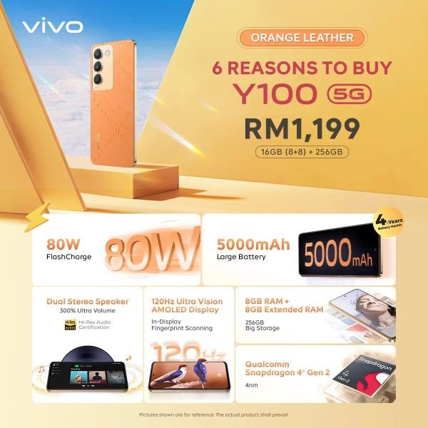 vivo fans who are interested can purchase the device starting from 23rd May 2024 with a premium gift box worth up to RM99. Here is the information on the price and the first sale of the vivo Y100 5G in Orange Leather.