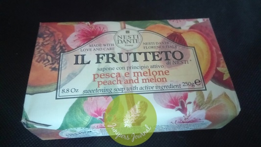 This soap has a peach and melon scent. There are other Il Frutteto variants such as citron & bergamot, fig & almond milk, medlar & jujube, mint & quince pear, olive oil & tangerine, pomegranate & blackcurrant and red grapes & blueberry. I am sure they all smell just as wonderful as the peach & melon.