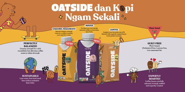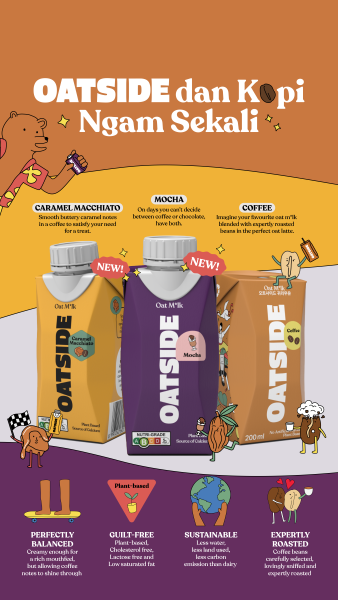 Both OATSIDE Caramel Macchiato and OATSIDE Mocha are made with expertly roasted coffee beans paired with the same OATSIDE oat base that you love, are plant-based, free of cholesterol and lactose with low saturated fats. Soon to be available at Family Mart, 7-Eleven, myNews, CU, Emart, Lotus, Jaya Grocer, Village Grocer, AEON, Shopee, TikTok Shop, and more.