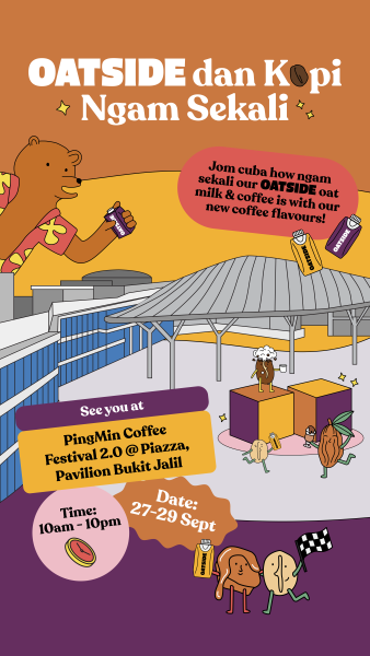 Dive into the vibrant world of coffee at Ping Min’s Coffee Festival 2.0, where OATSIDE proudly joins as an official partner to celebrate Malaysia’s love for all things coffee. From 27-29 September at Piazza, Pavilion Bukit Jalil, festival-goers can expect a blend of exciting activities and exclusive opportunities to bring home OATSIDE’s latest coffee flavour pocket packs and exclusive merchandise, available while stocks last.