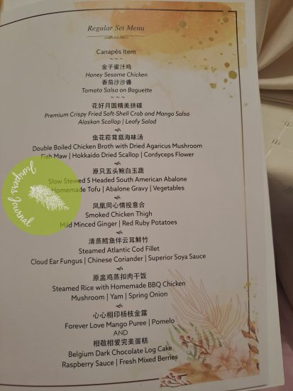 There were over 500 guests, all seated comfortably with plenty of room to spare in the Grand Lagoon Ballroom which can accommodate over 2000 guests. There was a tray of canapes on every table and a box of fruits (the wedding favours) on every seat. Each table accommodated 7 persons instead of the usual 10 at Chinese weddings but this wasn’t the typical Chinese wedding as guests were served individually, course by course.