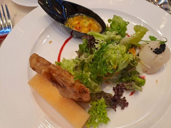 The dinner was supposed to start at 7pm but has anyone ever attended a wedding reception that started on time? At 7pm, most of the tables were still empty as the guests were still happily sipping cocktails in the foyer. My table was probably the earliest to be filled as the other guests were already seated there by the time I went in way before 7pm. There was a bottle of orange juice and a glass of lychee cocktail (the same one they served at the foyer) for each guest. Also a tray of canapes to be shared, almost all had been demolished by my fellow guests by the time I took my seat. The early bird does get all the canapes!