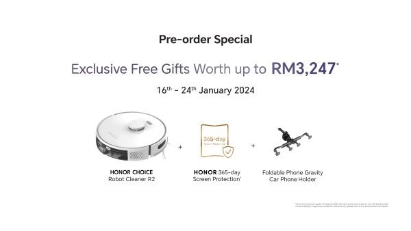 Early buyers will bring home exclusive free gifts worth up to RM3,247 consisting of the HONOR Choice Cleaner Robot, Foldable Phone Gravity Car Phone Holder, and HONOR 365-day Screen Protection.